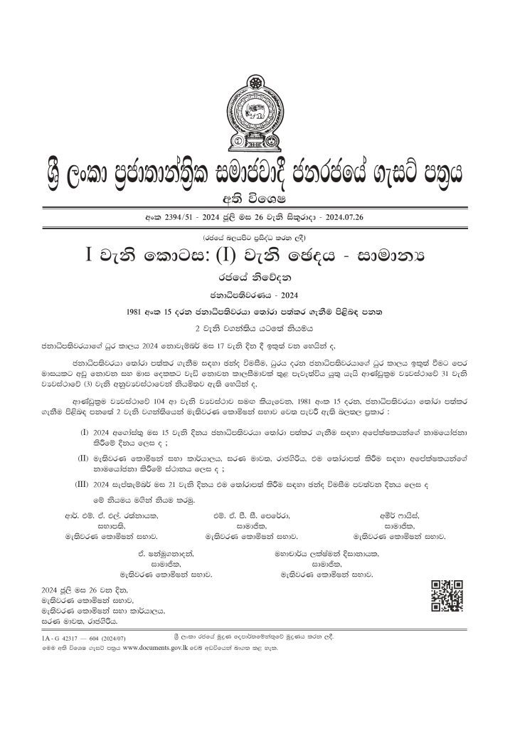 2024 ජනාධිපතිවරණය සඳහා නාමයෝජනා භාර ගන්නා දිනය අගෝස්තු 15 වෙනිදා ලෙසත්, ජනාධිපතිවරණය සඳහා ඡන්ද විමසීම පැවැත්වෙන දිනය සැප්තැම්බර් 21 ලෙසත් ඊට අදාල අති විශේෂ ගැසට් නිවේදනය නිකුත්කරමින් මැතිවරණ කොමිෂන් සභාව ප්රකාශයට පත්කර තිබෙනවා. එම අති විශේෂ ගැසට් නිවේදනය පහතින්.