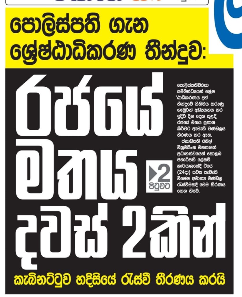 දේශබන්දු තෙන්නකෝන් නම් පුද්ගලයා පොලිස්පතිවරයා ලෙස කටයුතු කිරීම වලක්වාලමින් ශ්රේෂ්ඨාධිකරණය ඊයේ (24) ලබා දුන් තීන්දුව පිළිබද රජයේ මතය ඉදිරි දින දෙක ඇතුලත ප්රකාශ කිරීමට ඊයේ හවස හදිසියේ රැස්වූ කැබිනට් මණ්ඩලය තීරණය කලබව මාධ්ය වාර්තා කර තිබුණි.